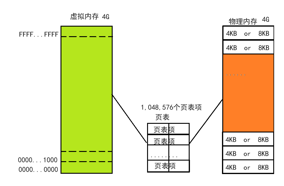 对于页表,页表中的每个页表项都指向一个物理块的起始地址,在32位操作系统下,虚拟内存的最大空间为4G。为了让每个程序使用上自己这4G的虚拟内存,页表就必须表示这4G的所有空间,那么页表就需要 4G / 4K(一个页框大小) = 1,048,576个页表项。如下图↓