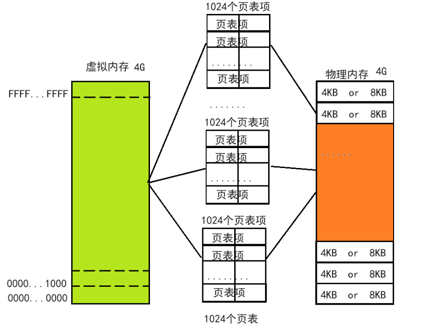 也许程序用不到这4G的虚拟内存,也许用户仅使用15MB的内存,那么只需使用4个页表(每个页表可映射4MB)即可。