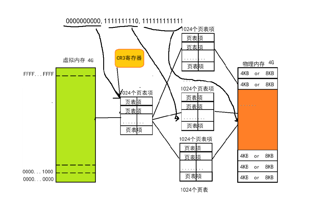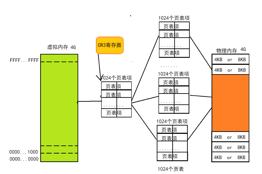 因为页表有着物理内存中页框的信息,CPU就可以通过虚拟内存(逻辑地址,32位机中,它的范围为0 到 4G - 1)间接访问物理内存。