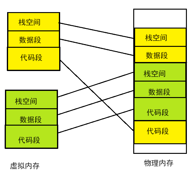 前面我们有简单谈过虚拟地址,我们知道操作系统直接使用的是虚拟地址,而虚拟地址又是通过页表来映射到物理内存的。通过页表映射,我们可以将一个程序的不同部分,存放到非连续的内存块中。如下图↓