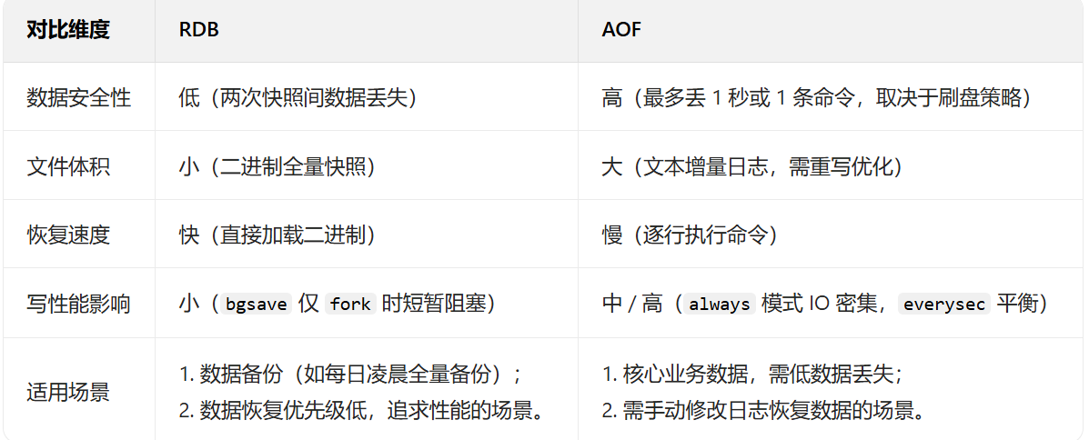RDB 是通过定时生成内存数据的 “快照”(Snapshot) 并保存到磁盘文件(默认 dump.rdb