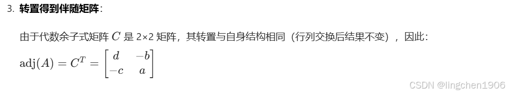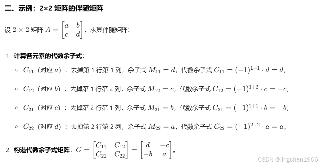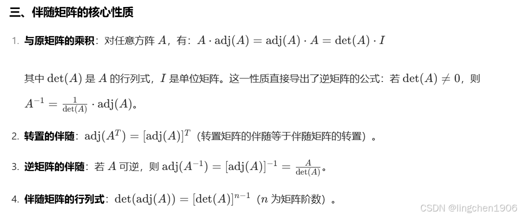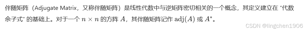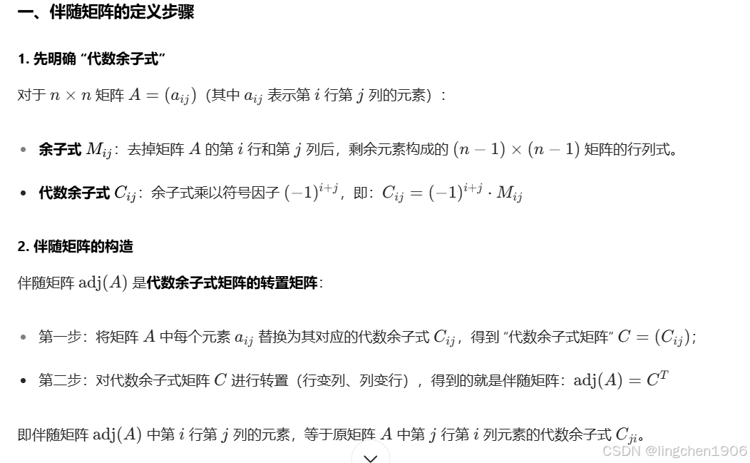 伴随矩阵的本质是 “代数余子式矩阵的转置”,它的核心作用是建立了矩阵与其逆矩阵的联系(通过 A−1=adj(A)/det(A))。尽管高阶矩阵的伴随矩阵计算复杂(需计算 n2 个代数余子式),但其理论意义重大,是理解逆矩阵、行列式性质的关键工具。