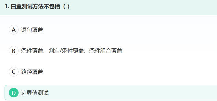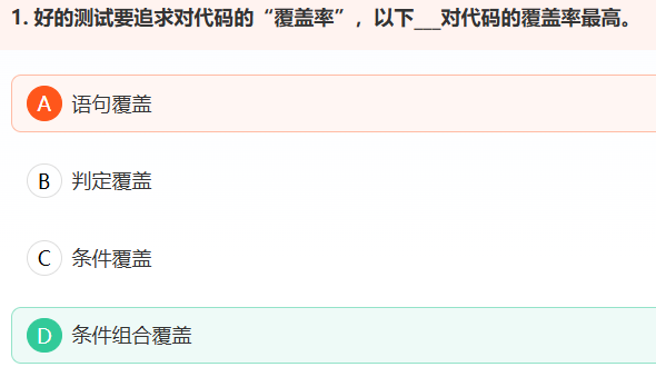 1. 语句覆盖(A选项):最基本的覆盖标准,只要求每条语句至少执行一次。覆盖率最低。
