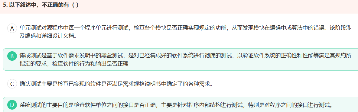 D选项错误:系统测试的目的不是检查软件单位之间的接口,这是集成测试的目的。系统测试是要验证集成后的系统是否满足系统说明书中规定的功能、性能等要求,是针对整个系统进行的测试。