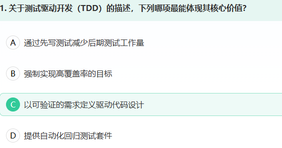 测试驱动开发(TDD)的核心价值是通过先写测试来定义可验证的需求,并以此驱动代码设计,确保代码质量与需求一致。