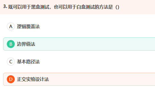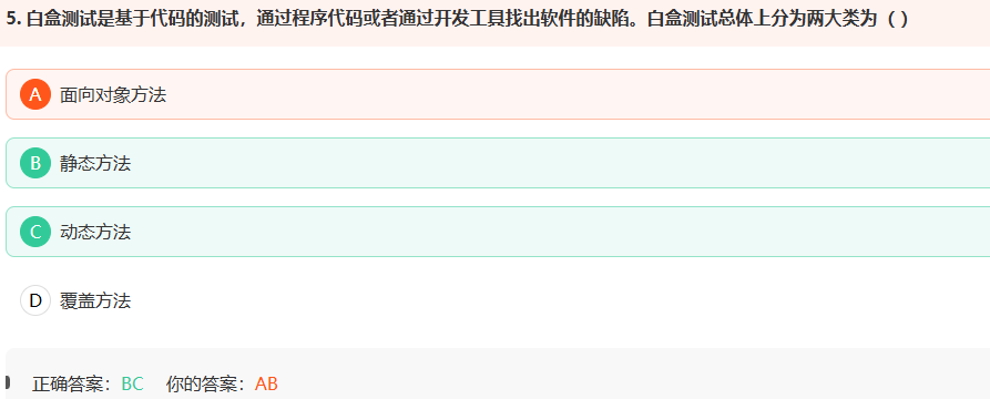 动态方法(C选项):需要运行程序才能发现程序中的错误和缺陷。包括语句覆盖、判定覆盖、条件覆盖、路径覆盖等测试方法。这种方法可以验证程序的实际运行效果。
