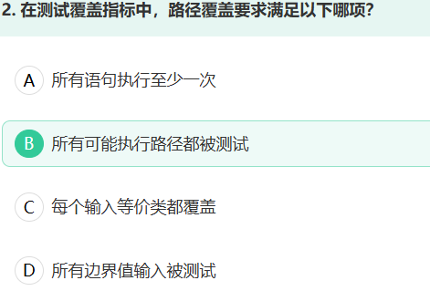2. 判定覆盖(B选项):要求判定结果的每个可能取值(真/假)都至少执行一次。比语句覆盖严格,但仍不够充分。