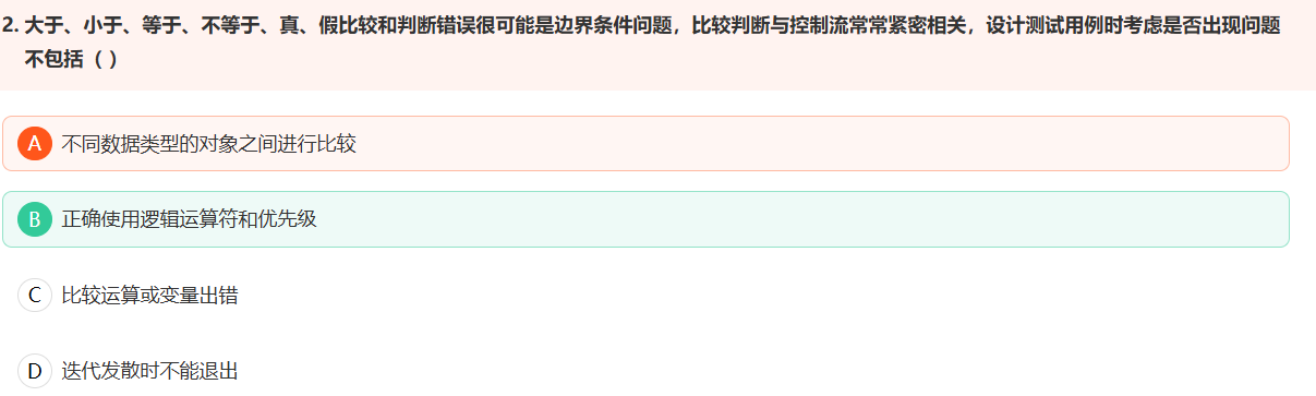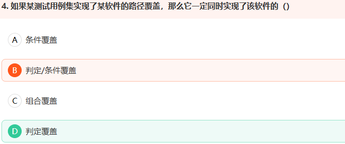 3. 条件覆盖(C选项):要求判定中每个条件的可能取值都至少执行一次。但无法保证所有组合都被测试到。