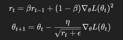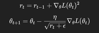 for batch in data_loader:grad = compute_gradient(Loss, θ, batch)r += grad ** 2θ -= lr / (sqrt(r) + eps) * grad
