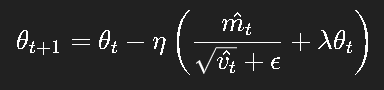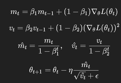 for t, batch in enumerate(data_loader, 1):grad = compute_gradient(Loss, θ, batch)m = beta1 * m + (1 - beta1) * gradv = beta2 * v + (1 - beta2) * (grad ** 2)m_hat = m / (1 - beta1 ** t)v_hat = v / (1 - beta2 ** t)θ -= lr * m_hat / (sqrt(v_hat) + eps)