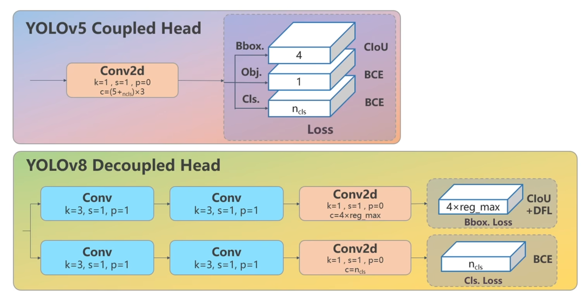 YOLOv8的Head部分从原先的耦合头变成了解耦头结构,简化了模型结构并提高了推理速度。