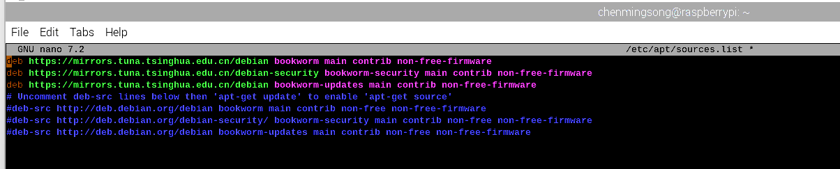 sudo nano /etc/apt/sources.list2、源代码前面都加一个 # 用来注销源代码,bookworm 系统用以下内容取代: