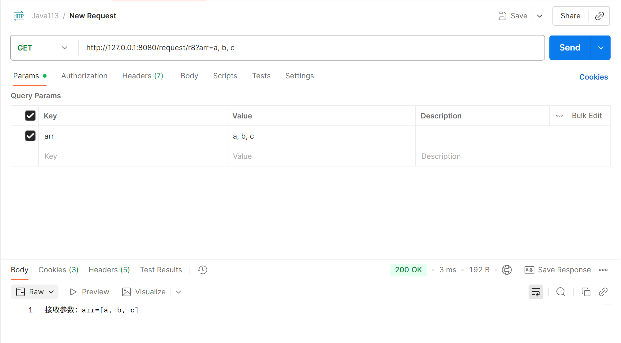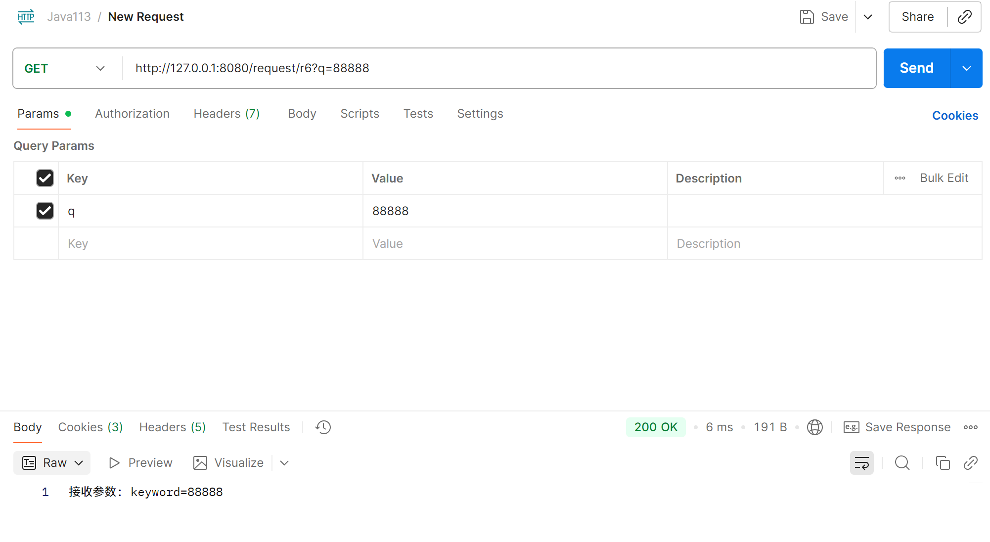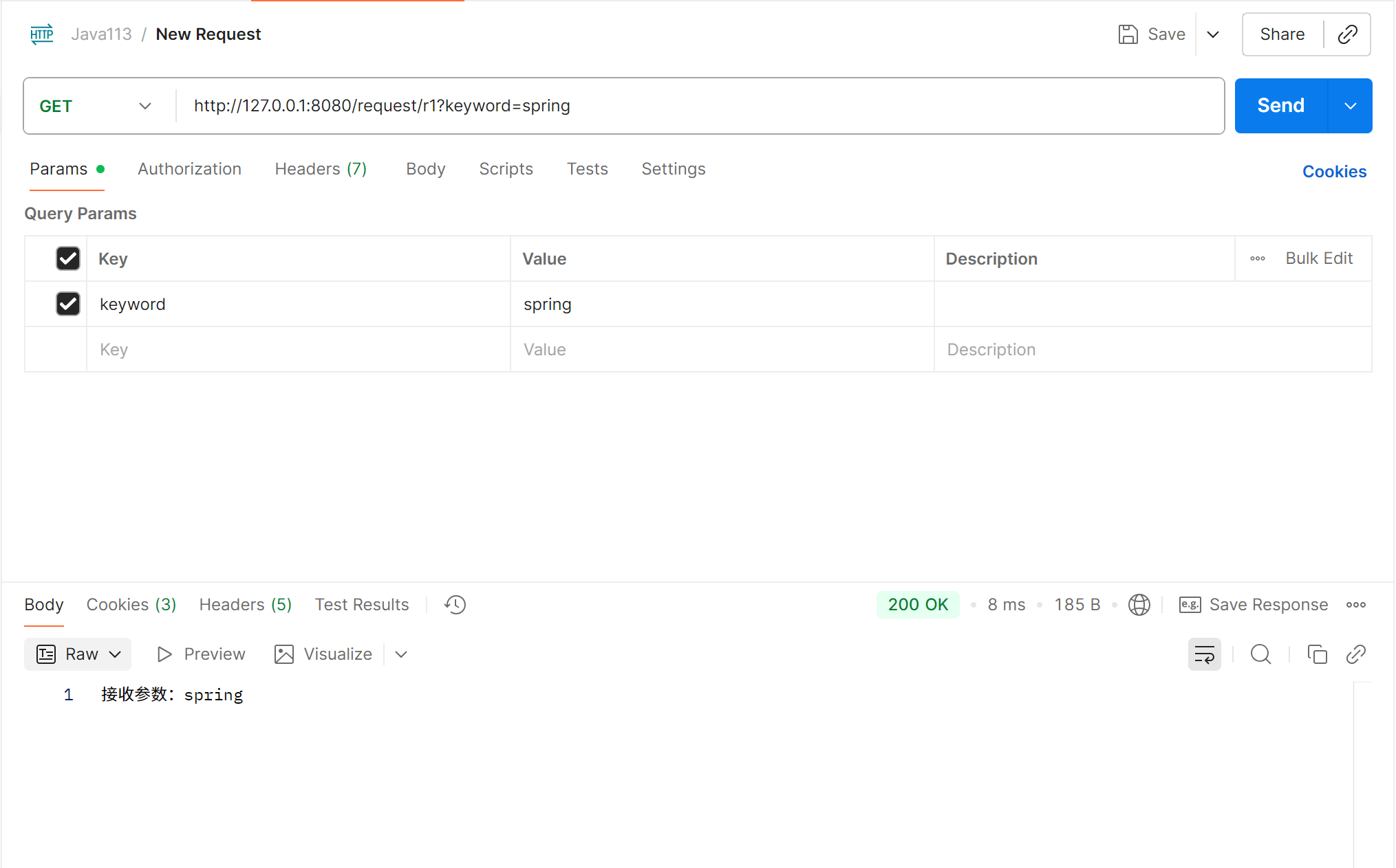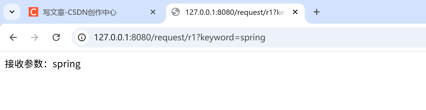 public class RequestController {@RequestMapping("/r1")public String r1(String keyword){return "接收参数:" + keyword;}