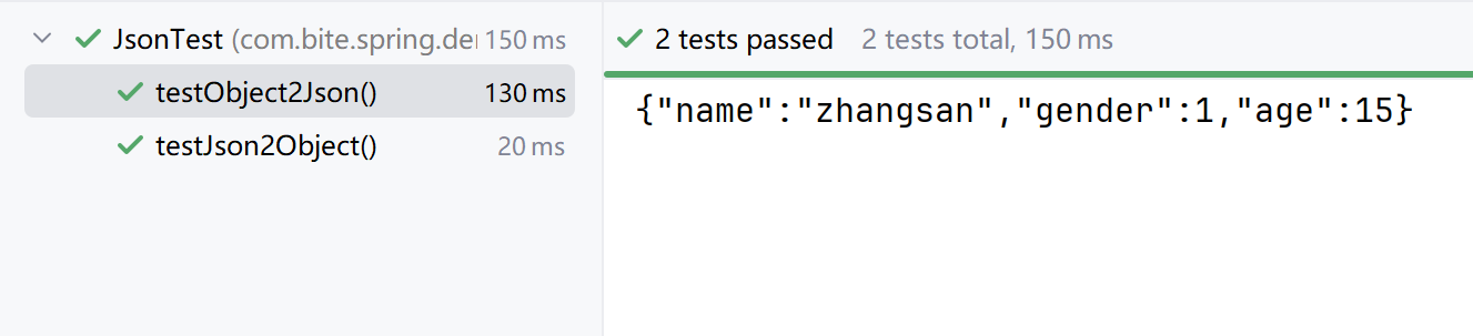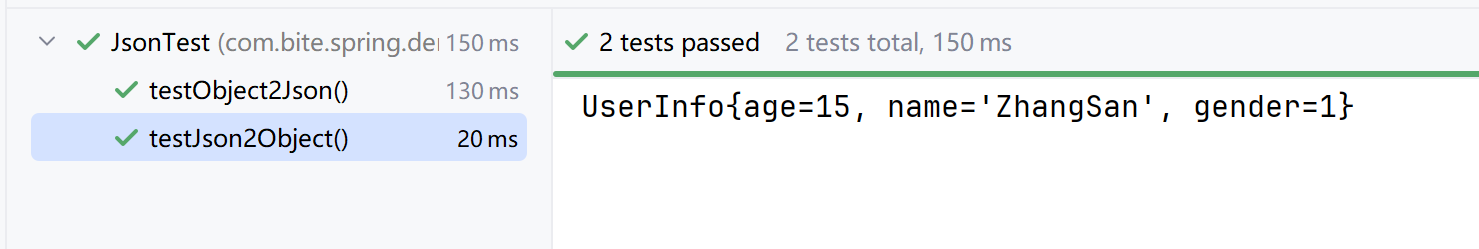 import org.junit.jupiter.api.Test;public class JsonTest {@Testvoid testObject2Json() throws JsonProcessingException {ObjectMapper objectMapper = new ObjectMapper();//创建java对象UserInfo userInfo = new UserInfo("zhangsan", 15, 1);//对象转jsonString s = objectMapper.writeValueAsString(userInfo);System.out.println(s);}@Testvoid testJson2Object() throws JsonProcessingException {ObjectMapper objectMapper = new ObjectMapper();//创建Json字符串String s = "{\"name\":\"ZhangSan\",\"gender\":1,\"age\":15}";//Json转对象UserInfo userInfo = objectMapper.readValue(s, UserInfo.class);System.out.println(userInfo);}