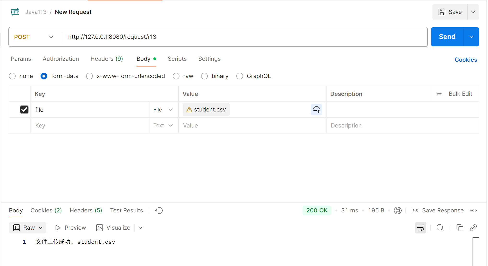 public String r13(MultipartFile file) throws IOException {file.transferTo(new File("D:\\temp\\" + file.getOriginalFilename()));return "文件上传成功: " + file.getOriginalFilename();