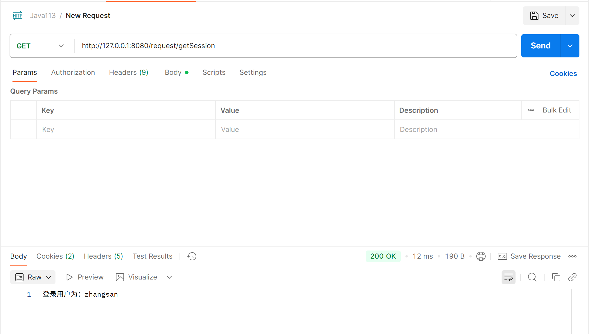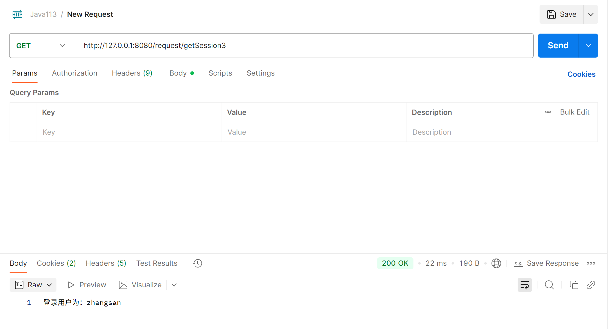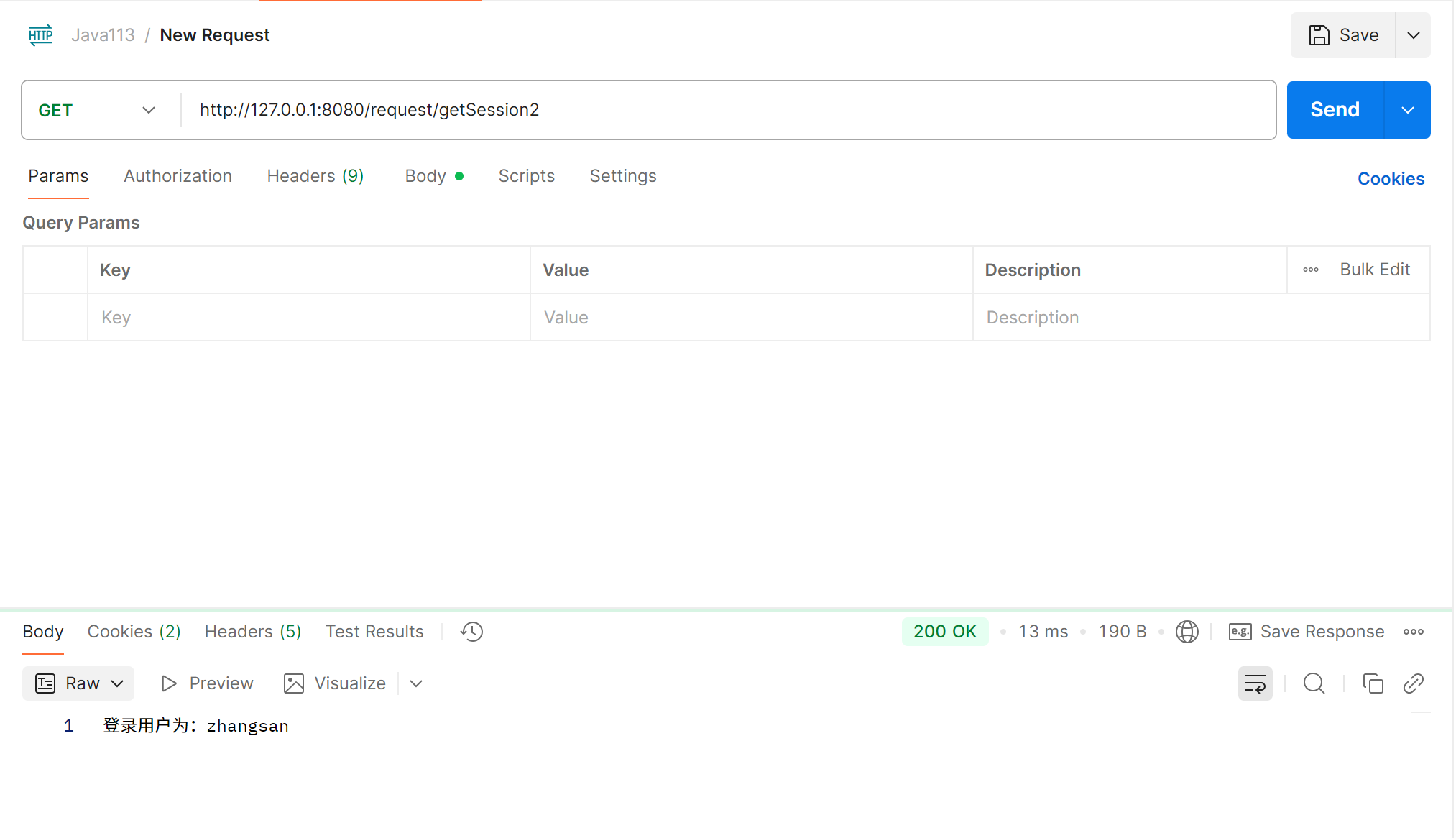 public String getSession2(HttpSession session) {//相当于getSession参数为true,则不存在session为null的情况String name = (String) session.getAttribute("name");return "登录用户为:" + name;