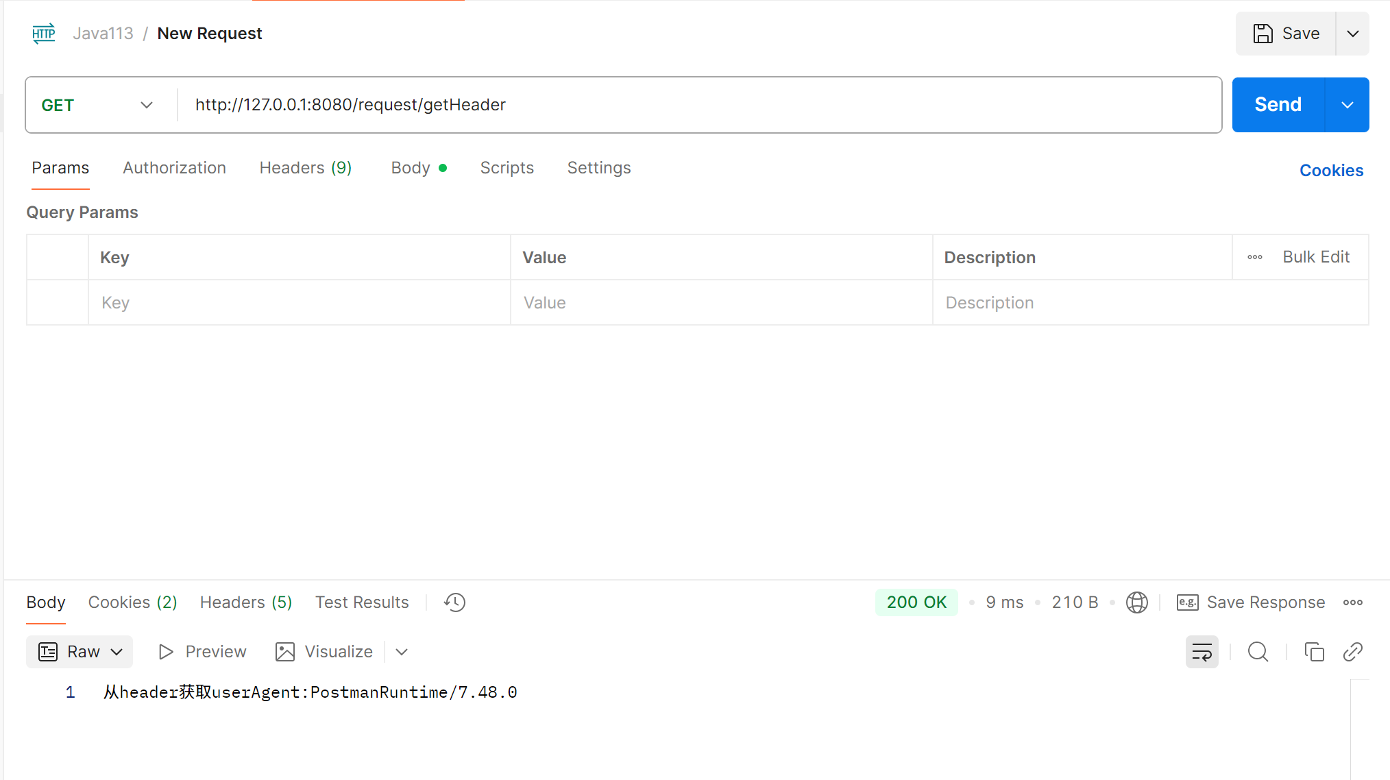 public String getHeader(HttpServletRequest request) {String userAgent = request.getHeader("User-Agent");return "从header获取userAgent:" + userAgent;