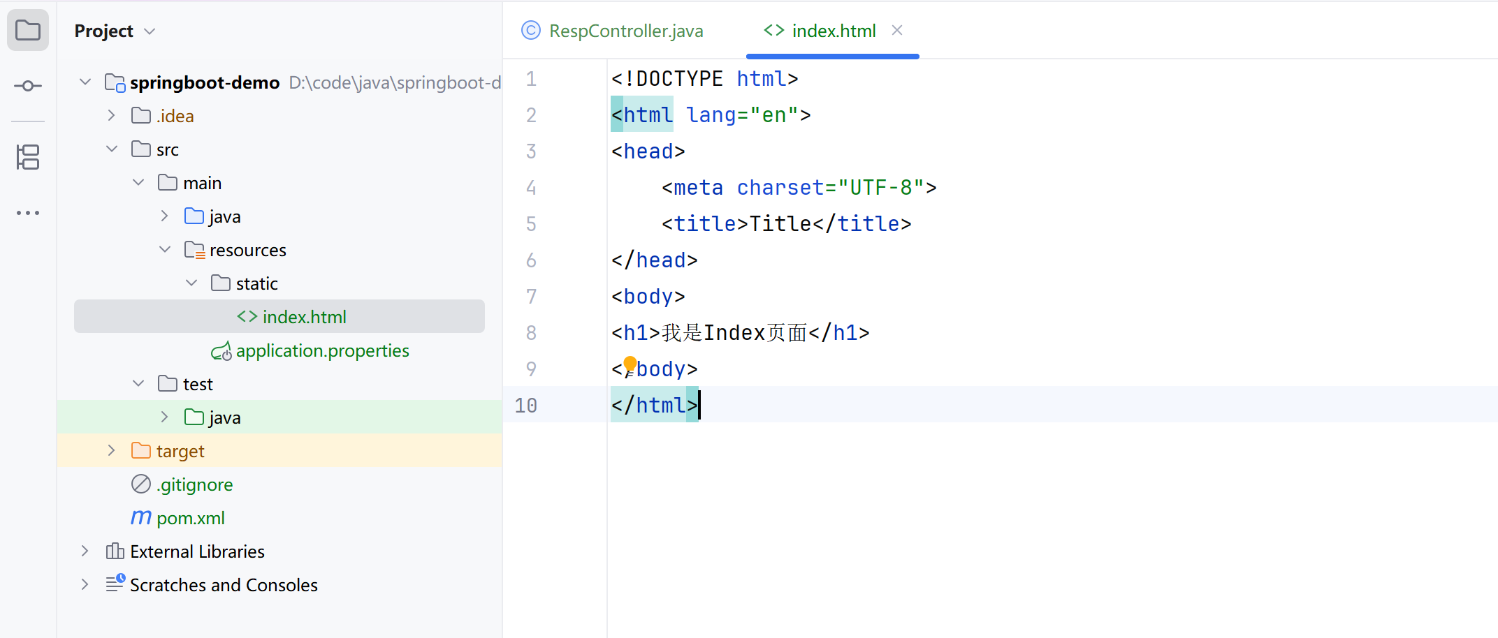 public class RespController {//返回页面@RequestMapping("/r1")public String returnPage(){return "/index.html";}