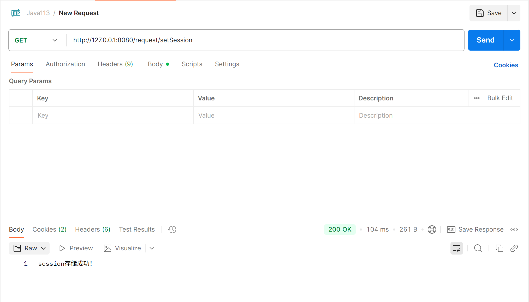 public String setSession(HttpServletRequest request) {//从Cookie中获取SessionID,再根据SessionID获取Session对象HttpSession session = request.getSession();//session默认存储在内存中session.setAttribute("name", "zhangsan");session.setAttribute("age", 15);return "session存储成功!";