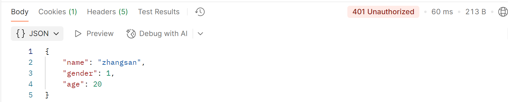 public UserInfo setStatus(HttpServletResponse response) {response.setStatus(401);return new UserInfo("zhangsan", 20, 1);