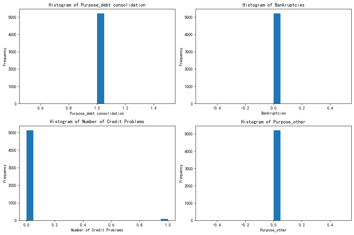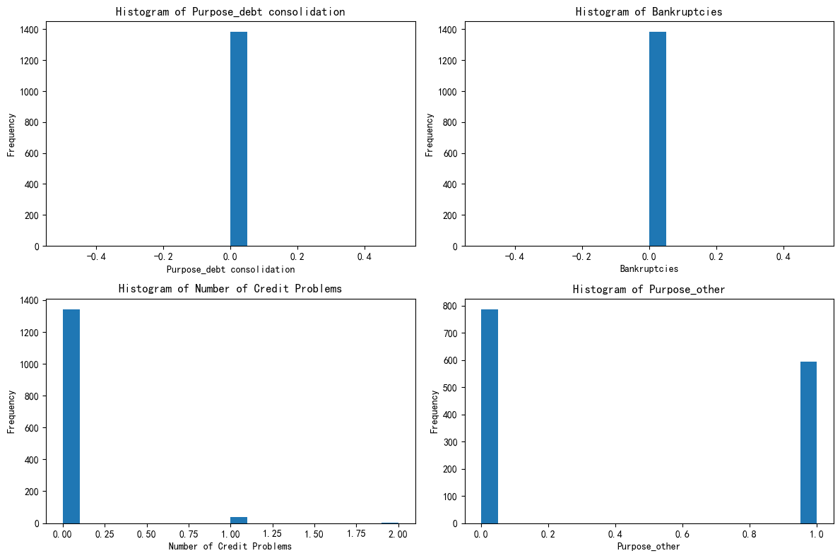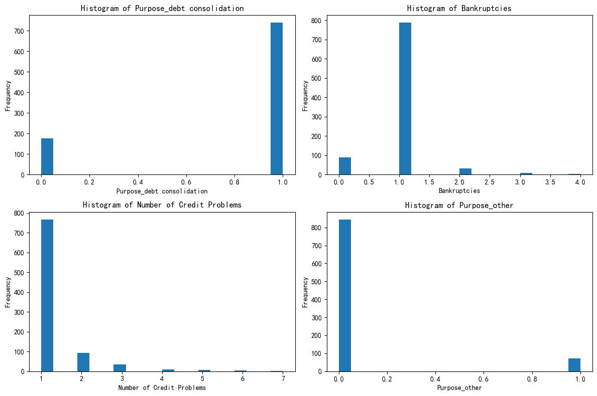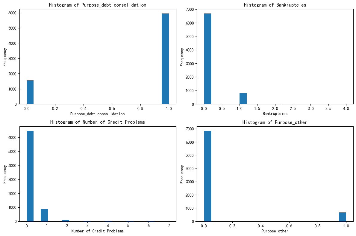 selected_features = ['Purpose_debt consolidation', 'Bankruptcies','Number of Credit Problems', 'Purpose_other']for feature in selected_features:unique_count = X[feature].nunique() #唯一值指的是在某一列或某个特征中,不重复出现的值#连续型变量通常有很多唯一值,而离散型变量的唯一值较少print(f'{feature}的唯一值数量是{unique_count}')if unique_count < 10:print(f"{feature}可能是离散变量")else:print(f"{feature}可能是连续变量")import matplotlib.pyplot as plt#总样本中的前四个重要性的特征分布图