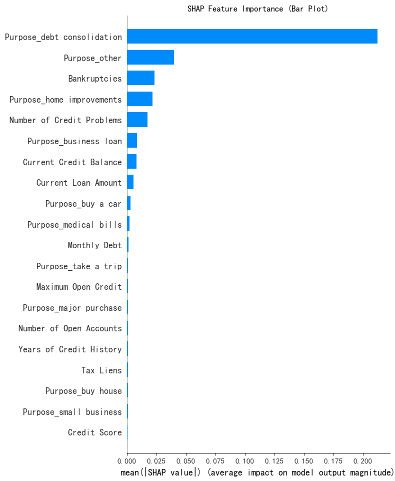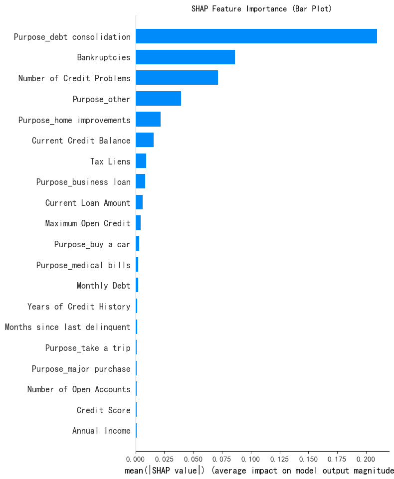 此处shap_values[:, :, 0] 的每一行代表的是一个特定样本每个特征对于类别0的贡献值(SHAP值),输出的是对类别0来说'Purpose_debt consolidation', 'Bankruptcies', 'Number of Credit Problems', 'Purpose_other'这四个特征最重要。