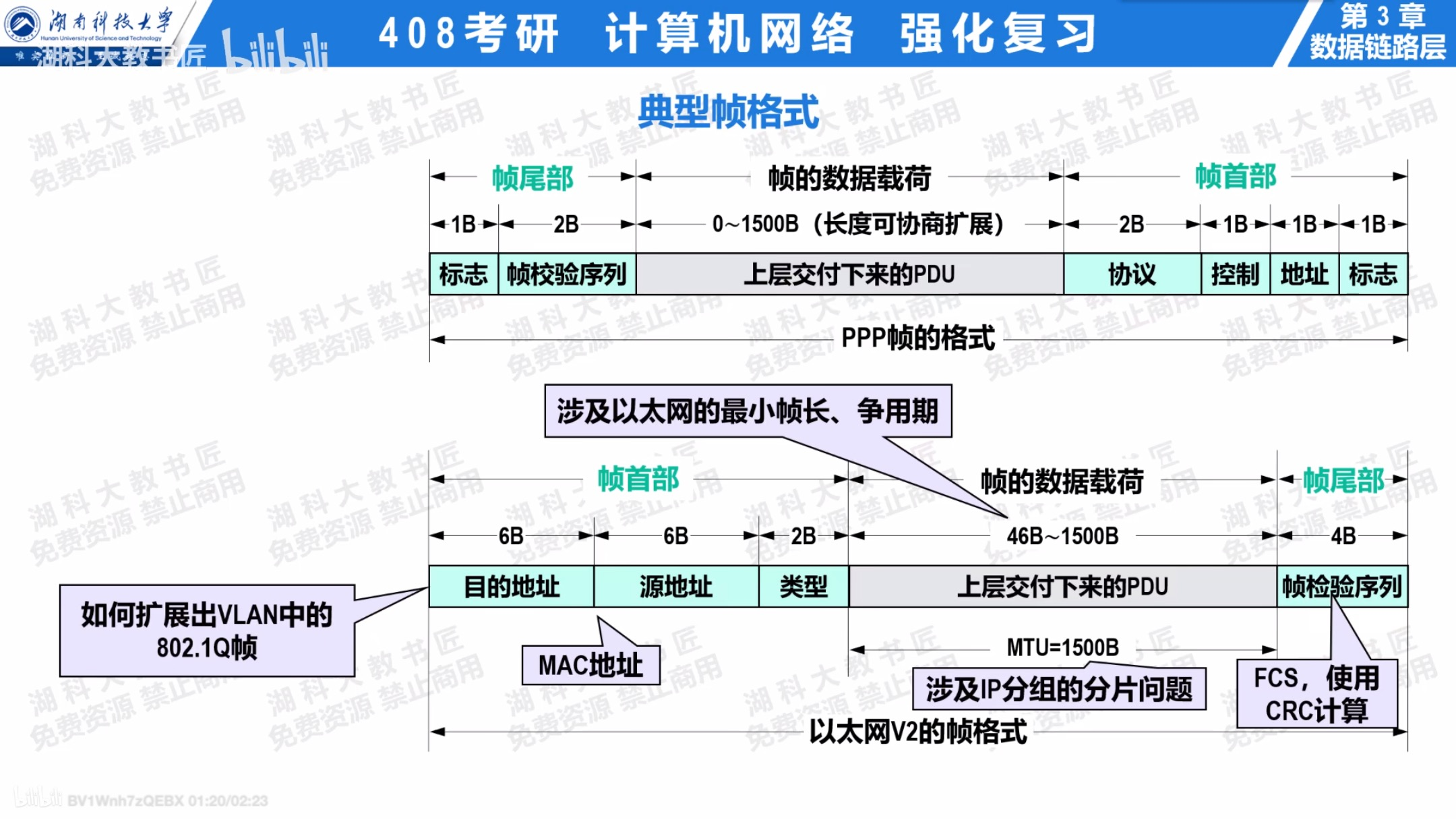 4: 帧校验序列,占 4 字节。用于CRC校验,检查帧在传输过程中是否出错。