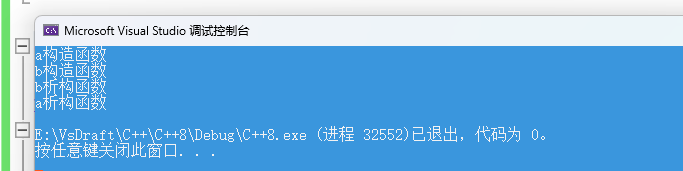 我们可以清晰的看到构造函数的调用是根据创建变量的顺序来的,但是析构函数却是相反的。这也就说明了他们分别的调用顺序是等到程序结束后析构函数才运行。