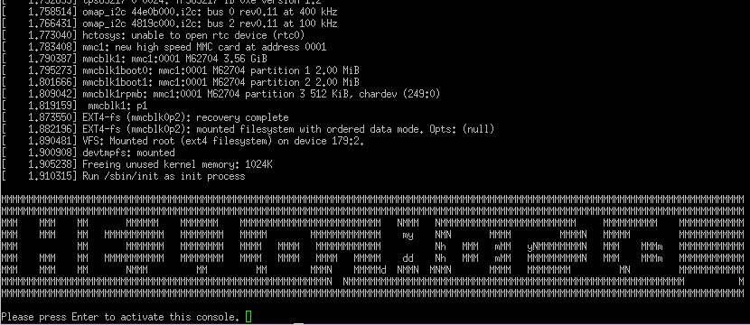 使用根文件系统启动BeagleBone Black后,内核启动1.910315秒后,系统会提示激活控制台并开始工作。