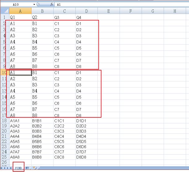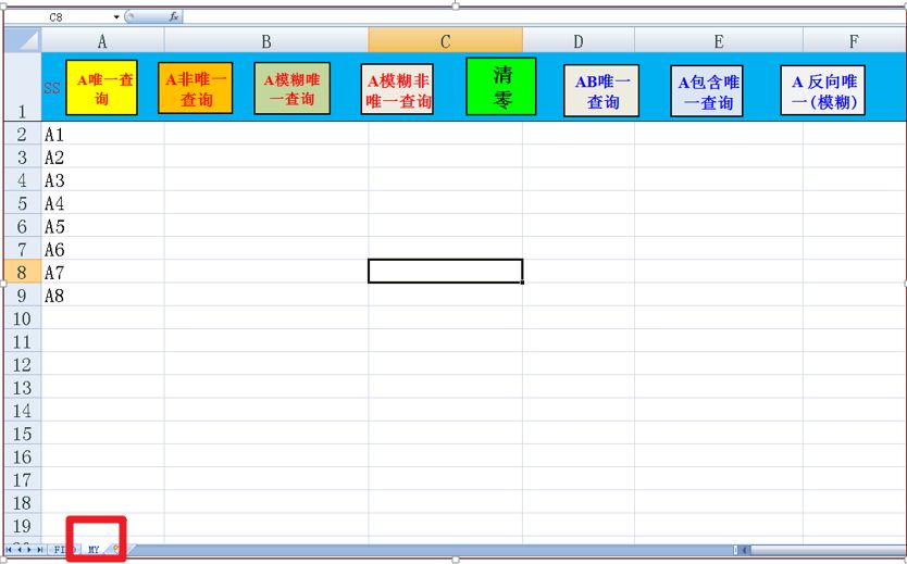 我在“MY”工作表的第一行加入了很多按钮,这些按钮可以实现不同的目的:有唯一查询,有非唯一查询,有模糊查询,两列查询等等,只要在“MY”的工作表A列中输入想要查询的数据,就会在“FIND”页的工作表中找到相应的记录,并把这些记录的相关信息记录在”MY”工作表的B2、 C2、 D2 等单元格内。从而实现了查找的自动化。例如上面的截图中,我在A列录入了几组数据A1 A2 A3 A4 A5 A6 A7 A8这些数据,在“FIND”工作表中是什么样子呢?我们看看“FIND”页工作表的截图: