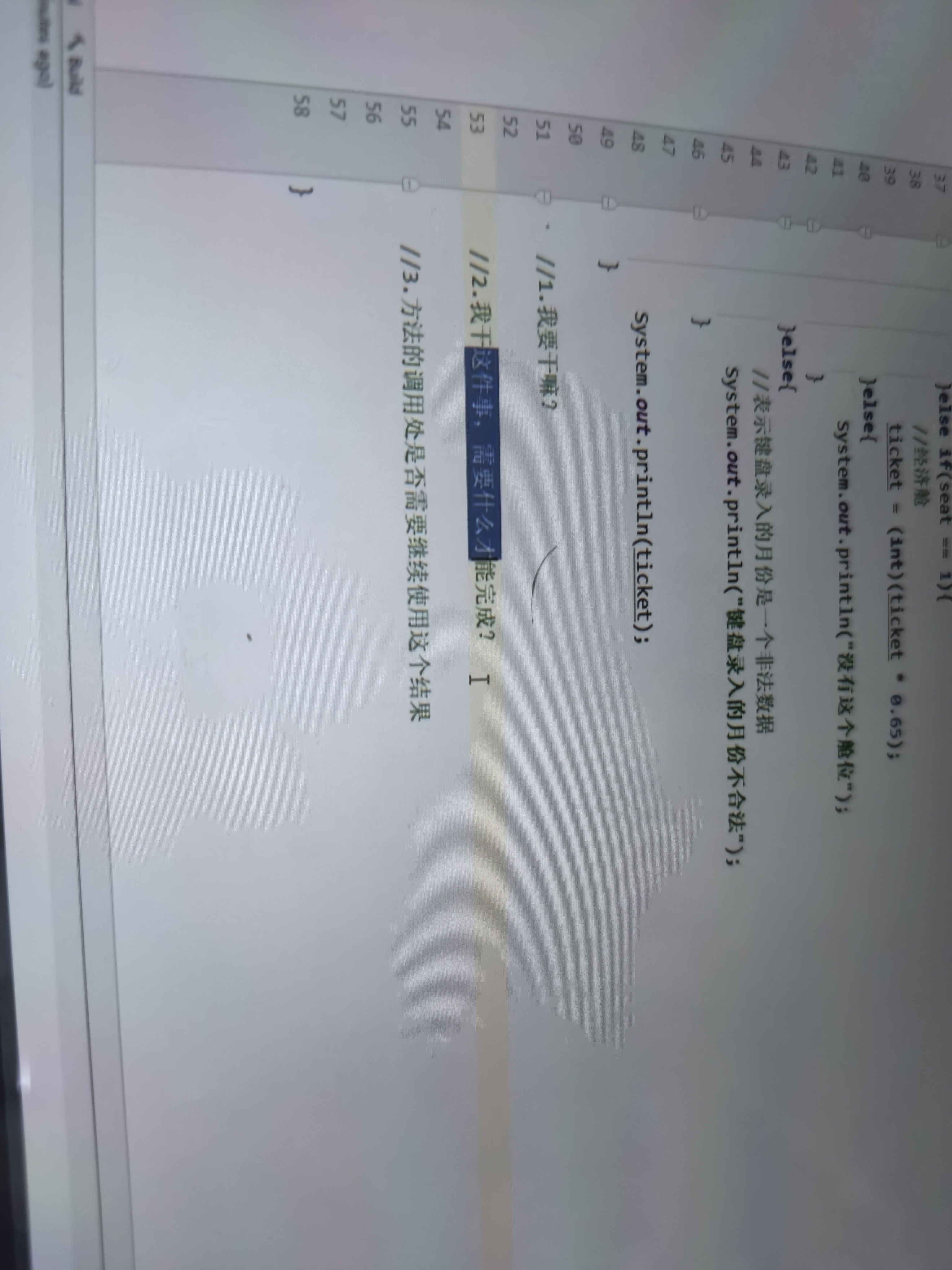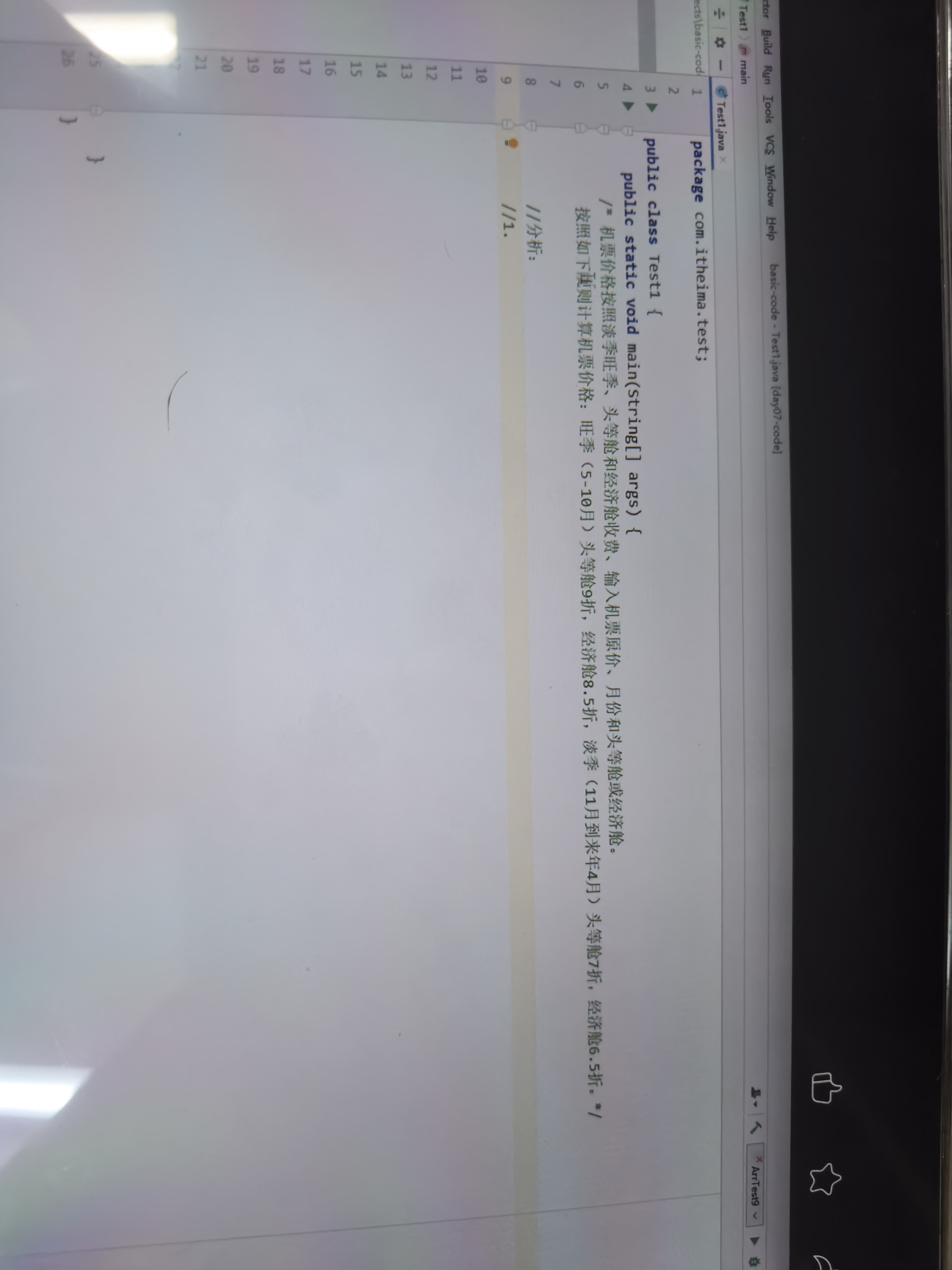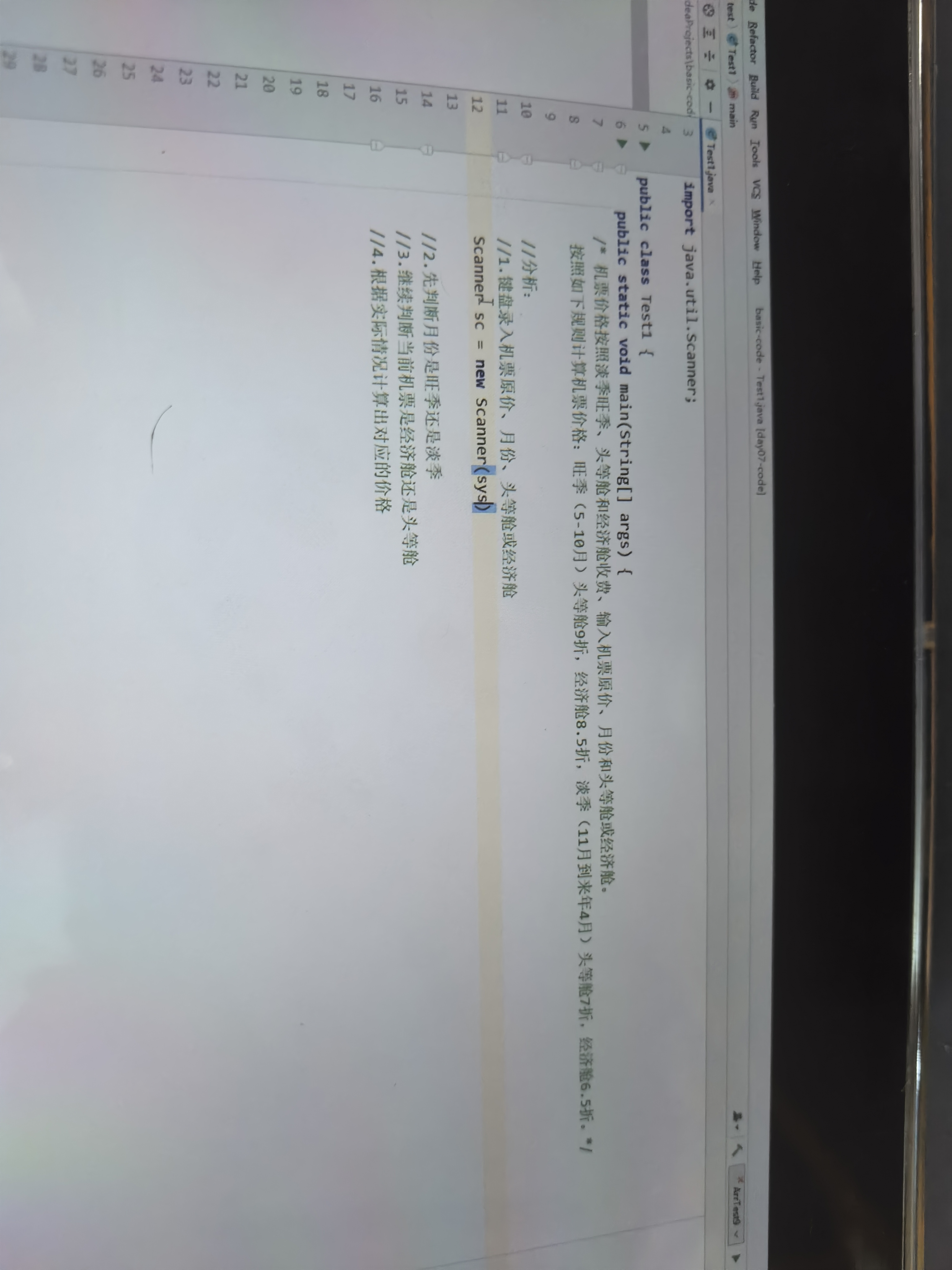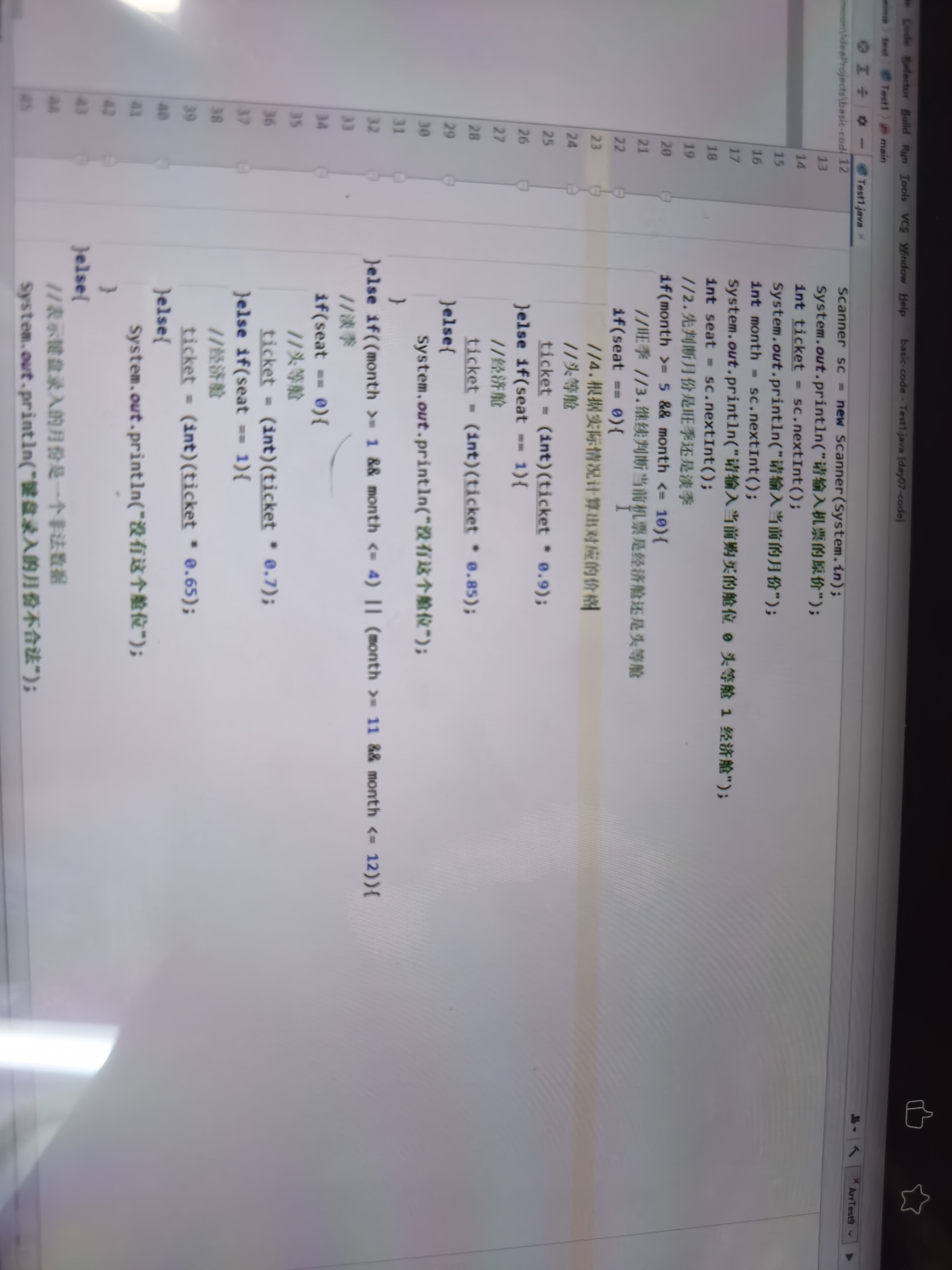 *这一题我的思路是8月份机票原价是搞一个键盘输入,然后再搞一个字符串类型的判断,判断是头等舱还是经济舱(用一二代替头等舱经济舱其实也可以),先判断淡季还是不淡季,然后再判断是不是头等舱,如果是头等舱,就打头等舱的折,是经济舱就打经济舱的折。