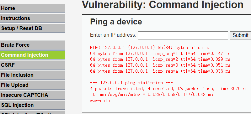 可以在最下面看到,whoami执行结果是www-data。其它命令这里不再展示。