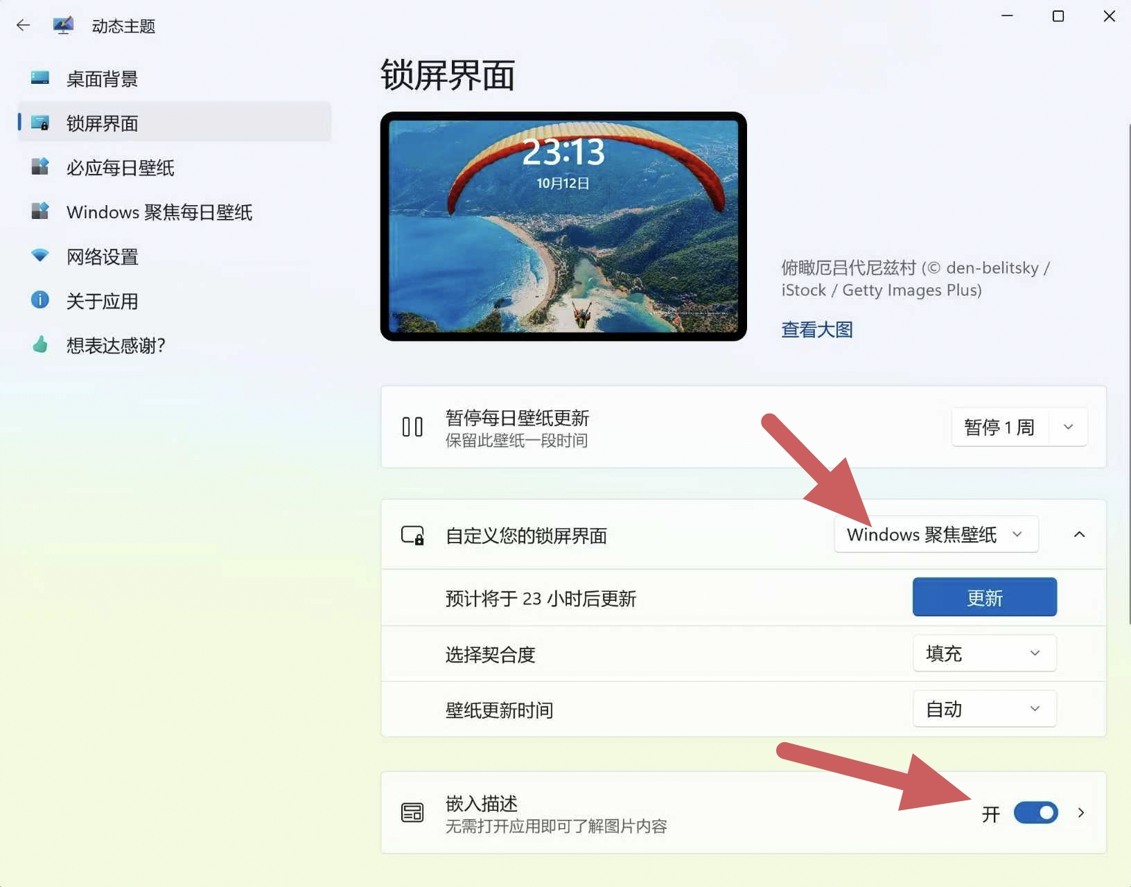 3.打开此软件进入锁屏界面将自定义您的锁屏界面更改为Windows聚焦壁纸(如果你的桌面背景也是Windows聚焦那你也要去更改一下),至于下面的那个嵌入描述,就是将一行对此图片的文字描述给嵌入进去,挺有趣的建议开启。