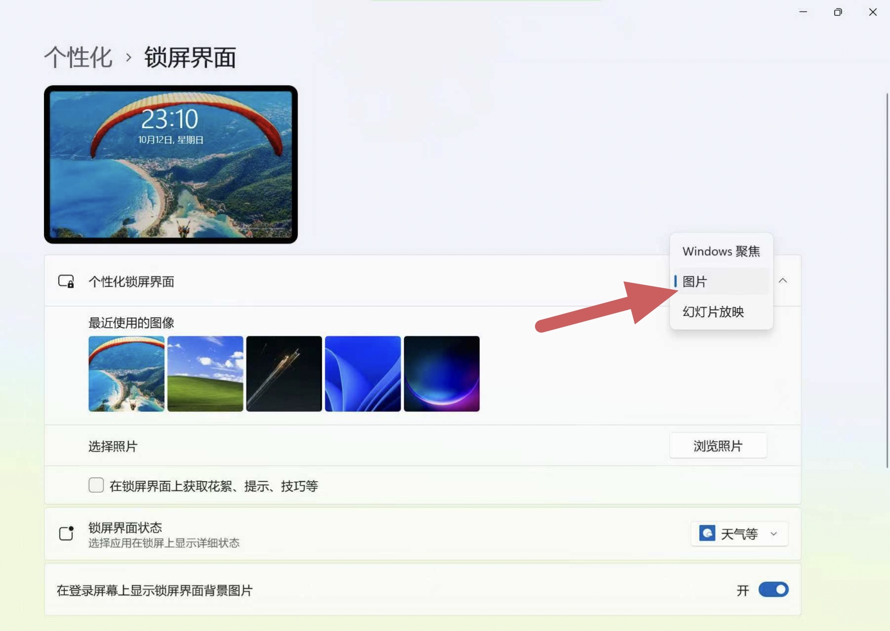 1.设置->个性化:将锁屏界面(如果你桌面也是使用的Windows聚焦那也要进入“背景”更改一遍)原本失效的Windows聚焦改为图片