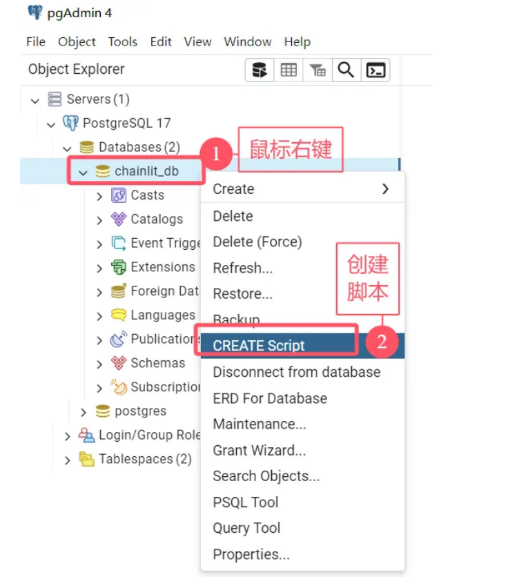 3、创建业务数据库:右键「Databases」→「Create」→「Database」,数据库名设为 chainlit_db