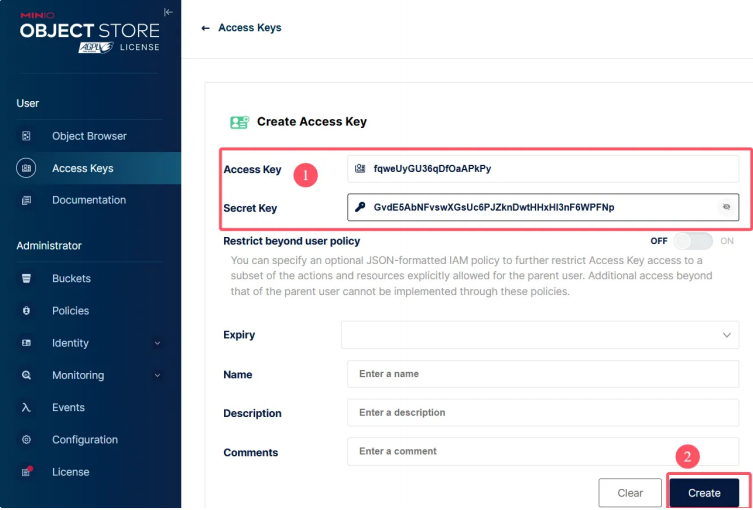 ),创建后保存「Access Key」和「Secret Key」(仅显示一次,后续配置需要)。