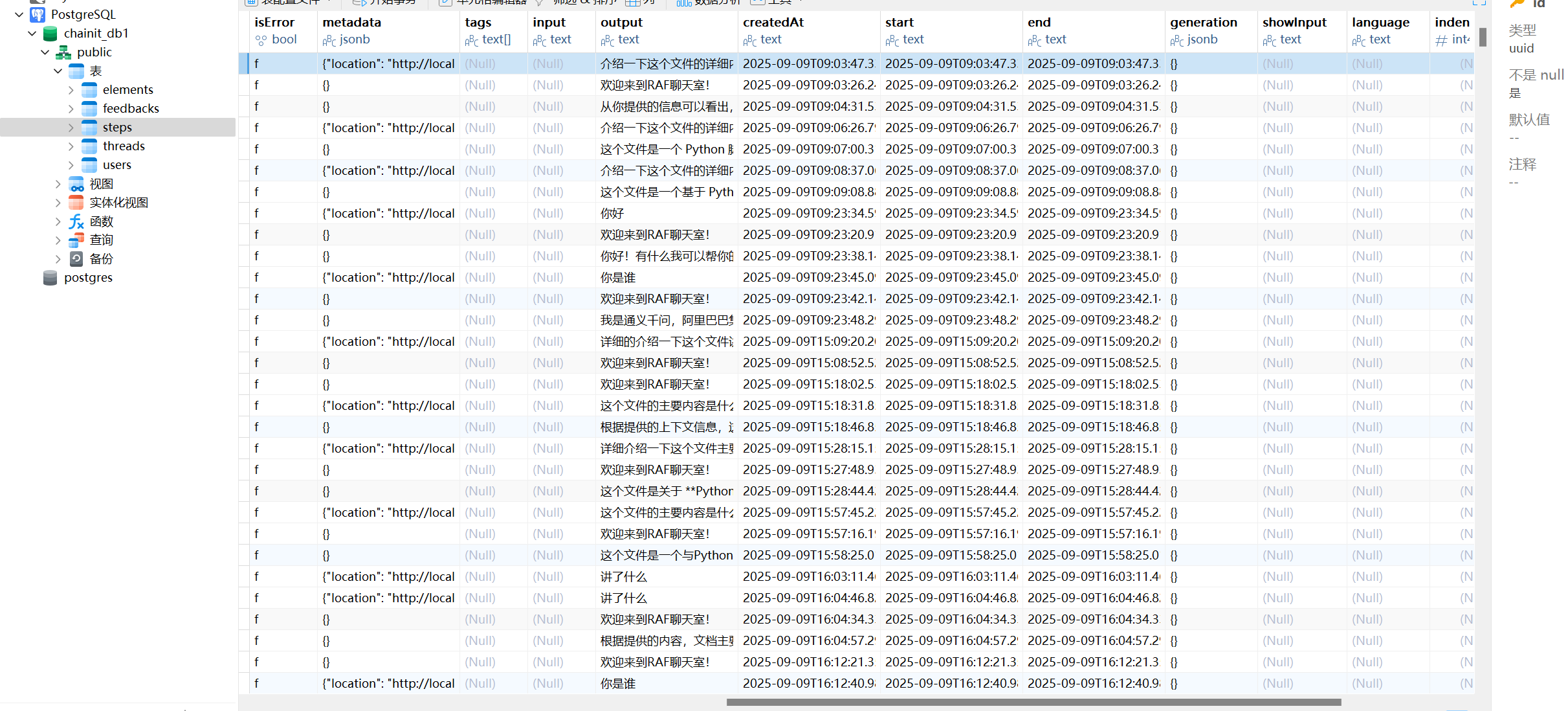 steps | 存储单条消息(用户输入 / 助手回复) | threadId (关联线程)、input/output (消息内容) |
