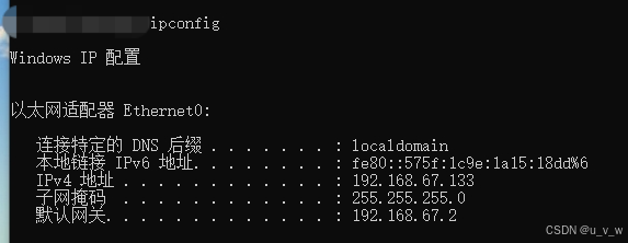1.打开虚拟机,找到cmd,输入以下命令,找到IPV4的地址,记住