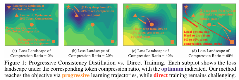 - 渐进式学习:在训练初期,教师模型和学生模型都采用较低的令牌压缩比,形成相对容易的学习任务。随着训练的进行,逐步增加压缩比,形成渐进式学习轨迹。