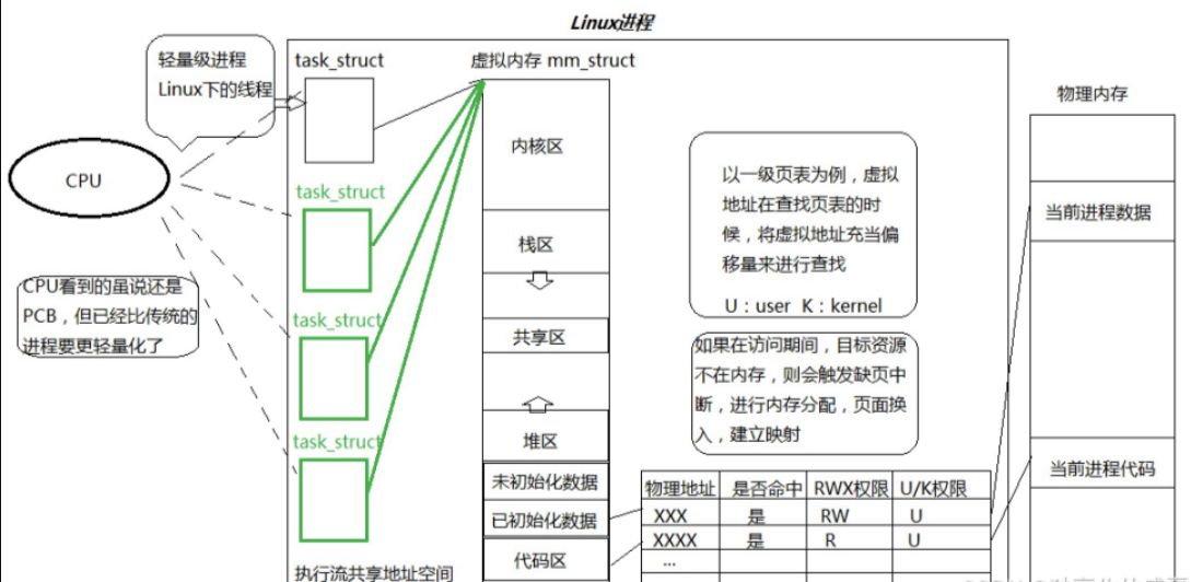除此之外,在CPU中还存在很多寄存器来存储进程/线程的上下文,存在一些寄存器保存的内容执行地址空间和页表。对于线程来说,地址空间和页表是相同的,这也意味着线程切换时我们不需要将所有线程的寄存器全部切换走;只需将少部分保存临时数据的寄存器切换即可!