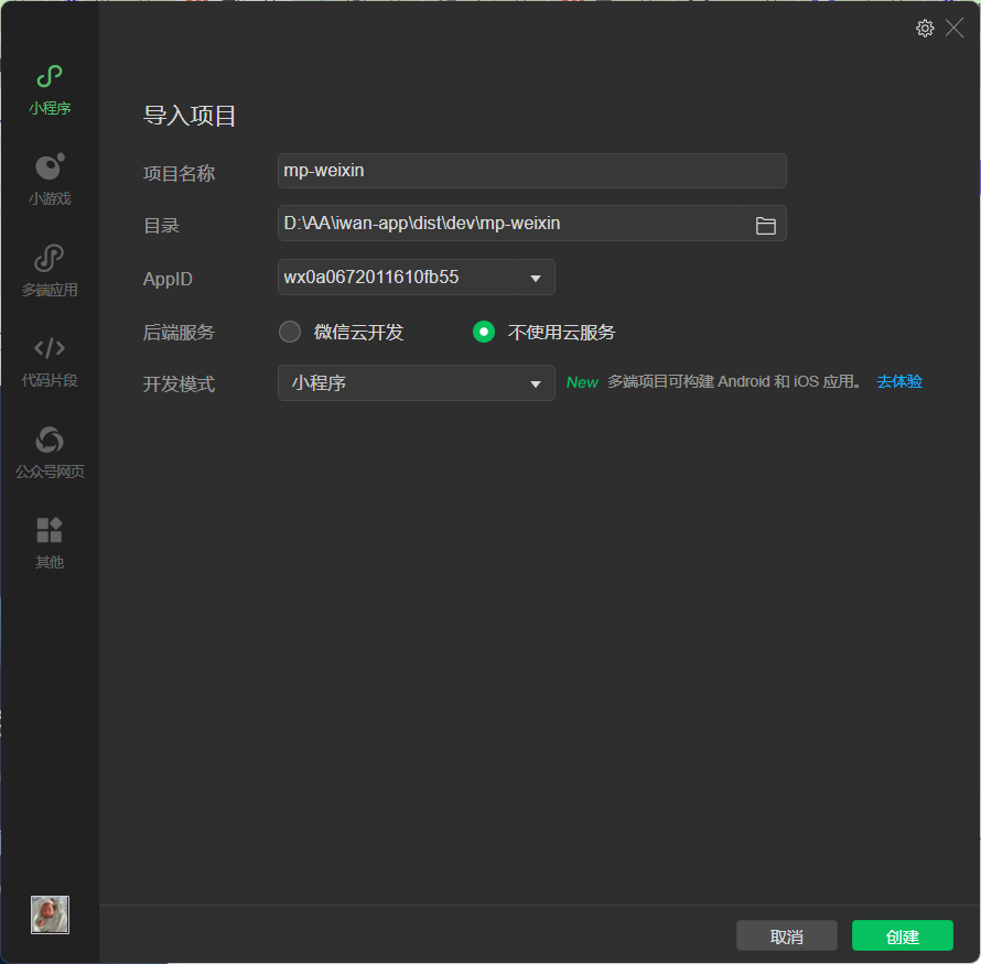 打开微信开发者工具,导入项目,这里我们不适用云开发,所以注意勾选掉。