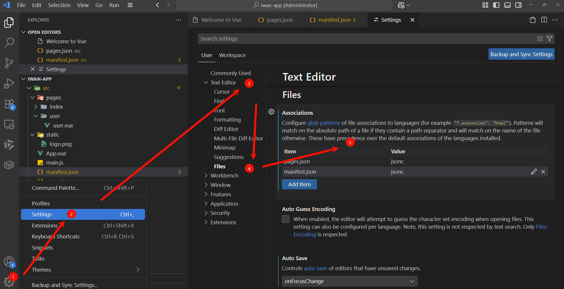 点击 【⚙】-> 【Settings】 -> 【TextEditor】 -> 【Associations 中添加上配置,设置为 jsonc 格式】