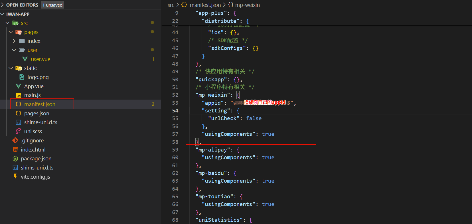 在 manifest.json 中添加自己的appid