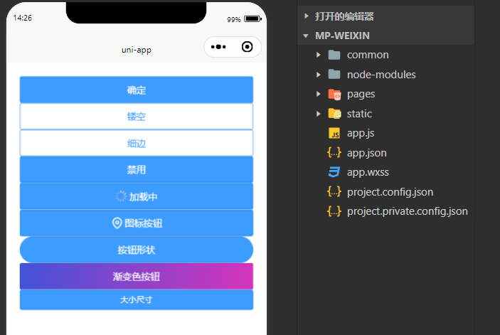 <template><view style="padding: 20px;"><up-button type="primary" text="确定"></up-button><up-button type="primary" :plain="true" text="镂空"></up-button><up-button type="primary" :plain="true" :hairline="true" text="细边"></up-button><up-button type="primary" :disabled="disabled" text="禁用"></up-button><up-button type="primary" loading loadingText="加载中"></up-button><up-button type="primary" icon="map" text="图标按钮"></up-button><up-button type="primary" shape="circle" text="按钮形状"></up-button><up-button text="渐变色按钮" color="linear-gradient(to right, rgb(66, 83, 216), rgb(213, 51, 186))"></up-button><up-button type="primary" size="small" text="大小尺寸"></up-button></view>