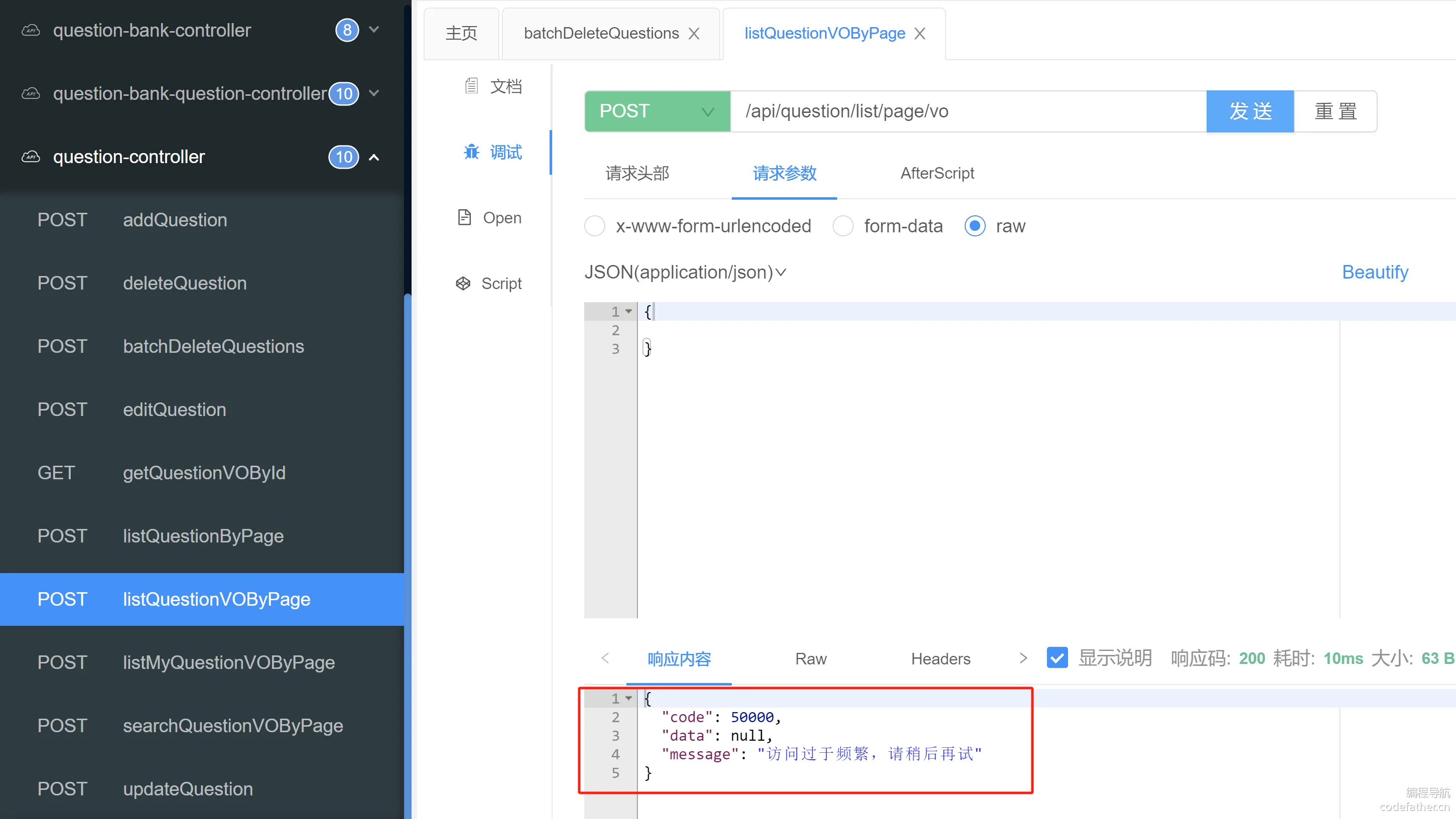 } catch (BlockException ex) {// 资源访问阻止,被限流或被降级if (ex instanceof DegradeException) {return handleFallback(questionQueryRequest, request, ex);}// 限流操作return ResultUtils.error(ErrorCode.SYSTEM_ERROR, "访问过于频繁,请稍后再试");