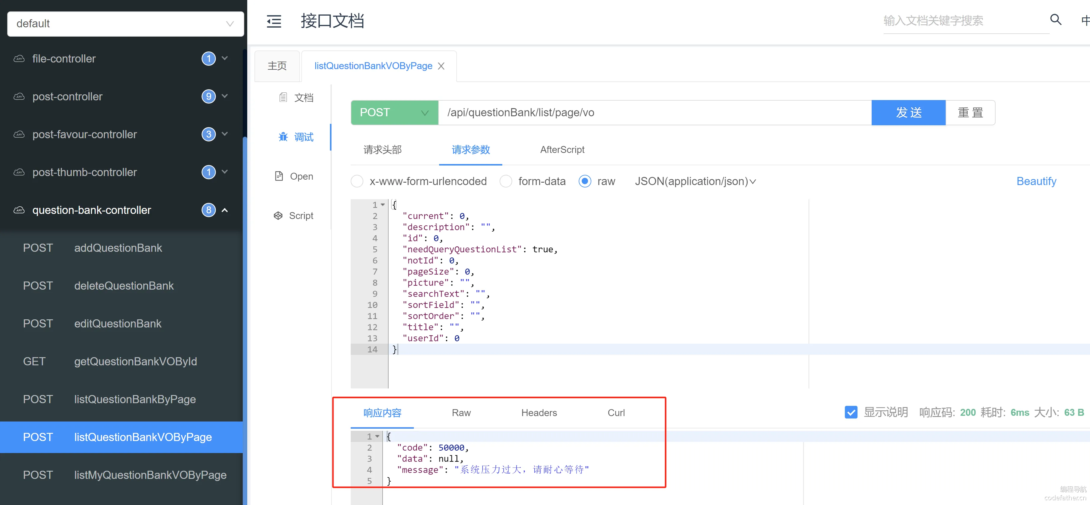 }/*** listQuestionBankVOByPage 流控操作* 限流:提示"系统压力过大,请耐心等待"*/