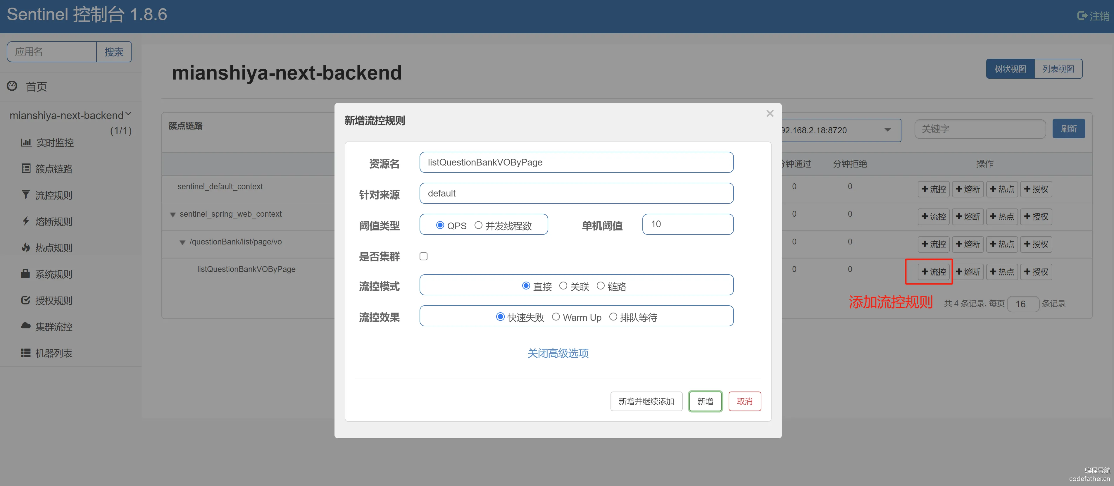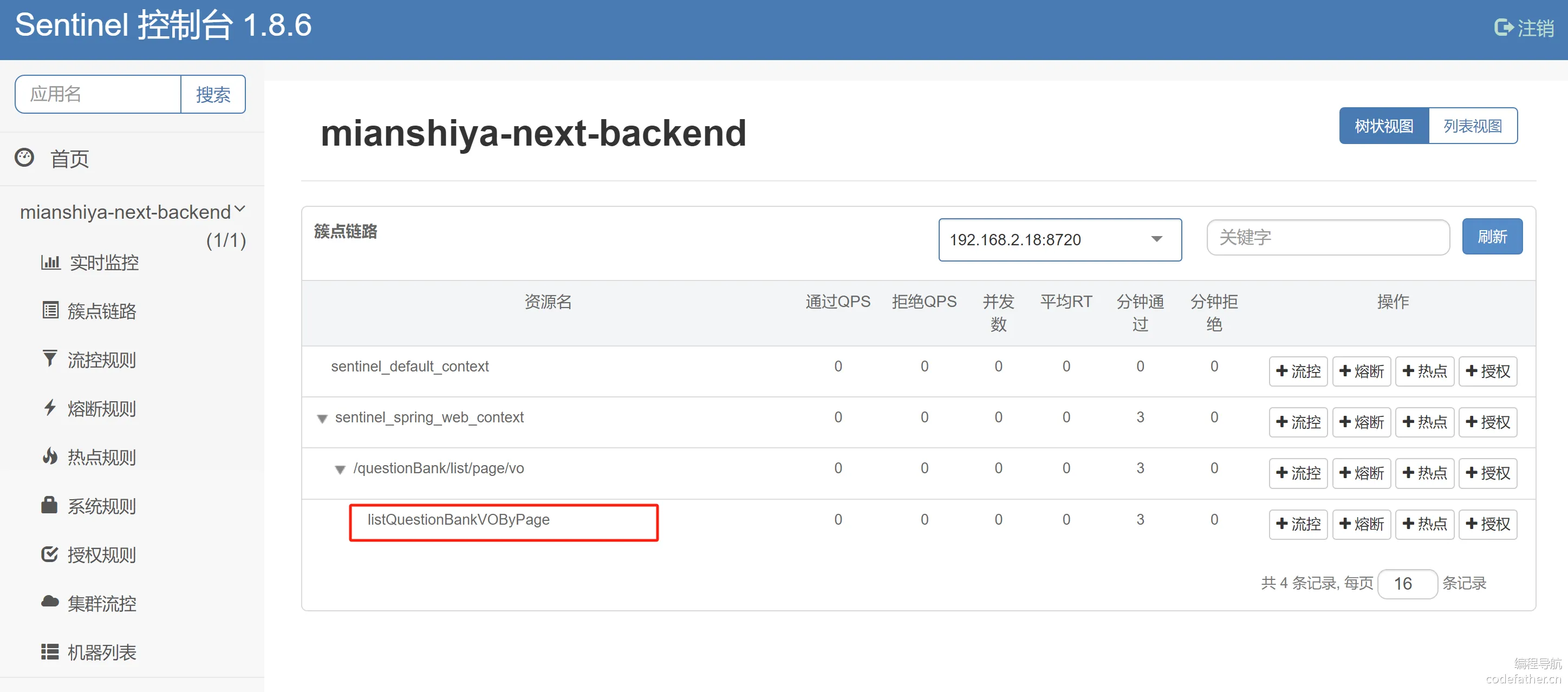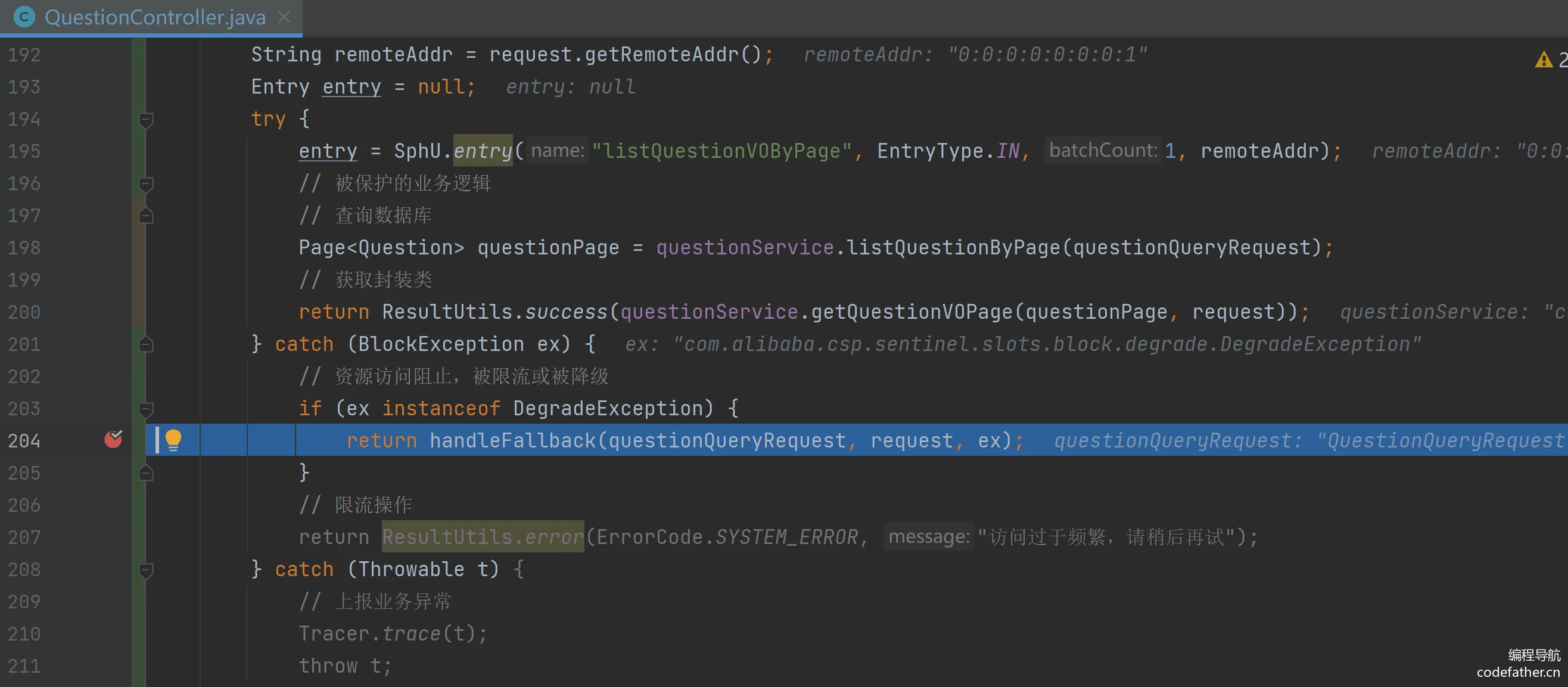try {entry = SphU.entry("listQuestionVOByPage", EntryType.IN, 1, remoteAddr);// 被保护的业务逻辑// 查询数据库Page<Question> questionPage = questionService.listQuestionByPage(questionQueryRequest);// 获取封装类return ResultUtils.success(questionService.getQuestionVOPage(questionPage, request));