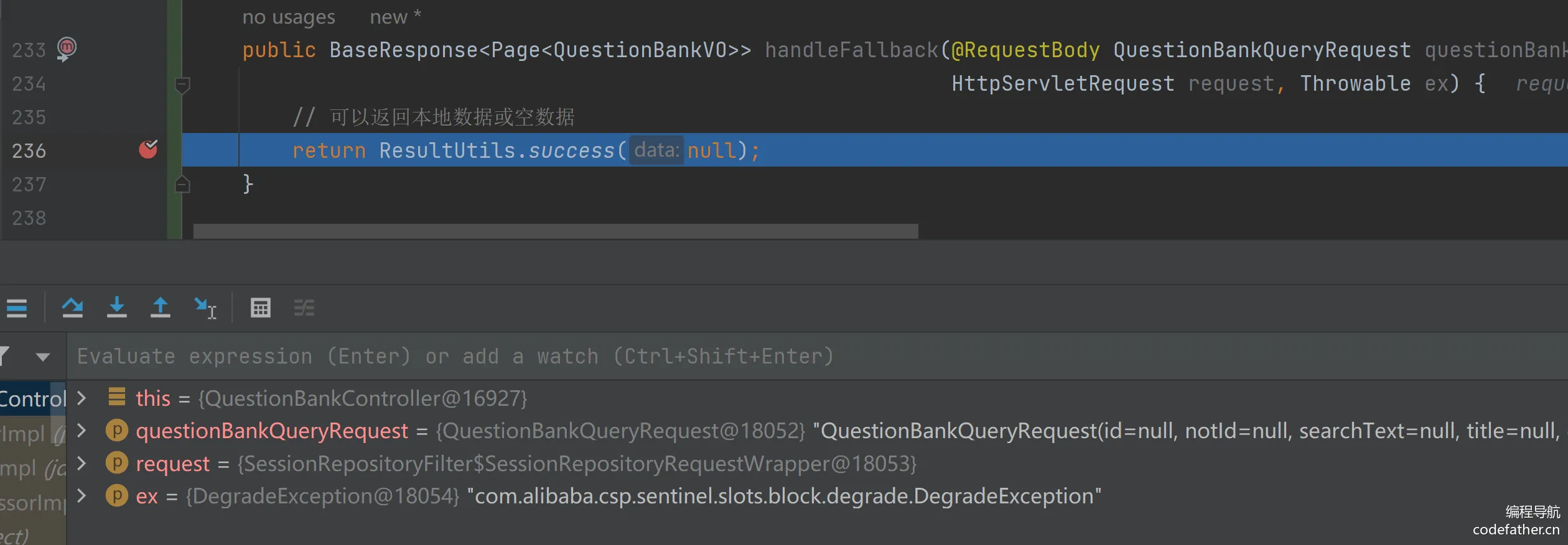 public BaseResponse<Page<QuestionBankVO>> handleBlockException(@RequestBody QuestionBankQueryRequest questionBankQueryRequest,HttpServletRequest request, BlockException ex) {// 降级操作if (ex instanceof DegradeException) {return handleFallback(questionBankQueryRequest, request, ex);}// 限流操作return ResultUtils.error(ErrorCode.SYSTEM_ERROR, "系统压力过大,请耐心等待");