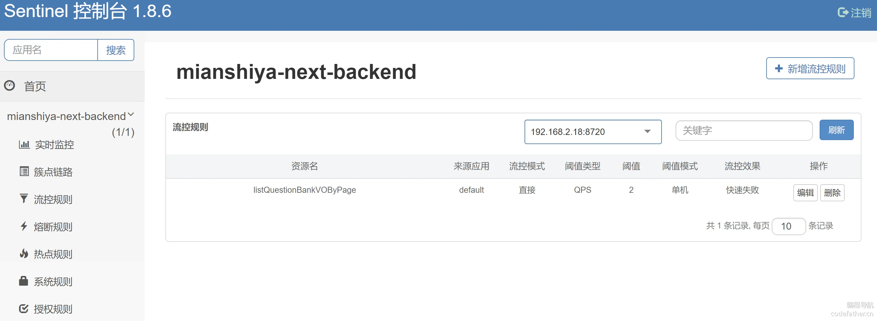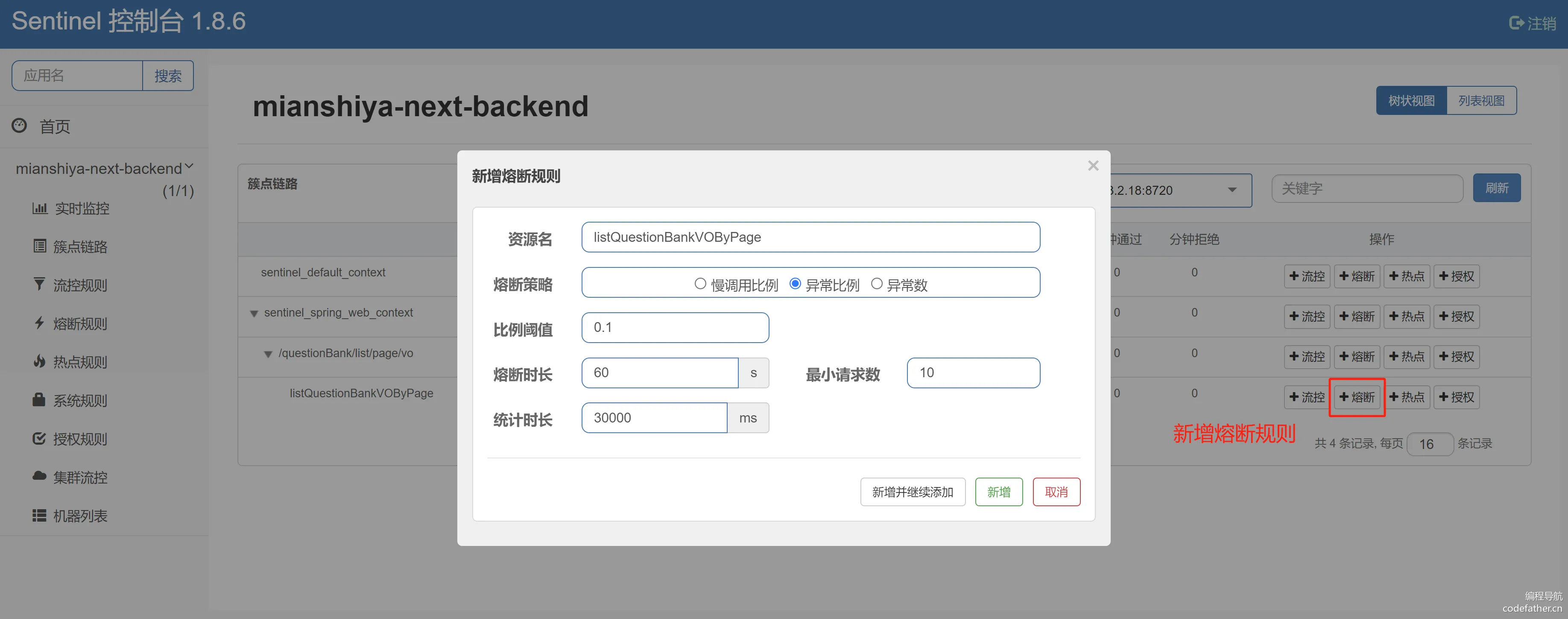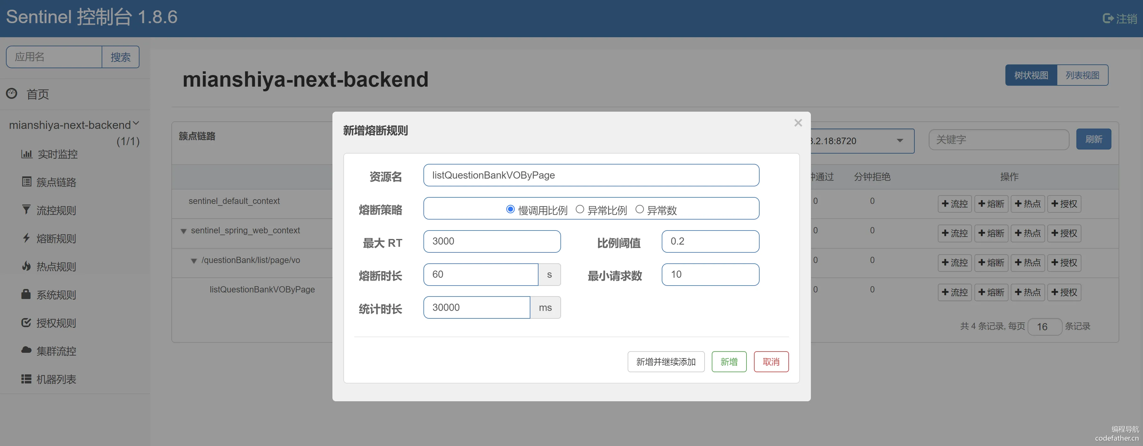 public class SentinelRulesManager {@PostConstructpublic void initRules() {initFlowRules();initDegradeRules();}// 限流规则public void initFlowRules() {// 单 IP 查看题目列表限流规则ParamFlowRule rule = new ParamFlowRule("listQuestionVOByPage").setParamIdx(0) // 对第 0 个参数限流,即 IP 地址.setCount(60) // 每分钟最多 60 次.setDurationInSec(60); // 规则的统计周期为 60 秒ParamFlowRuleManager.loadRules(Collections.singletonList(rule));}// 降级规则public void initDegradeRules() {// 单 IP 查看题目列表熔断规则DegradeRule slowCallRule = new DegradeRule("listQuestionVOByPage").setGrade(CircuitBreakerStrategy.SLOW_REQUEST_RATIO.getType()).setCount(0.2) // 慢调用比例大于 20%.setTimeWindow(60) // 熔断持续时间 60 秒.setStatIntervalMs(30 * 1000) // 统计时长 30 秒.setMinRequestAmount(10) // 最小请求数.setSlowRatioThreshold(3); // 响应时间超过 3 秒DegradeRule errorRateRule = new DegradeRule("listQuestionVOByPage").setGrade(CircuitBreakerStrategy.ERROR_RATIO.getType()).setCount(0.1) // 异常率大于 10%.setTimeWindow(60) // 熔断持续时间 60 秒.setStatIntervalMs(30 * 1000) // 统计时长 30 秒.setMinRequestAmount(10); // 最小请求数// 加载规则DegradeRuleManager.loadRules(Arrays.asList(slowCallRule, errorRateRule));}